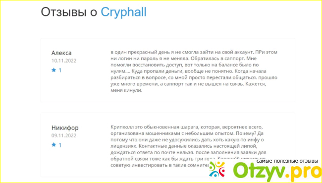 Большинство отзывов о проекте негативные, особенно о команде и руководстве. Сотрудники проекта вводят посетителей в заблуждение, обещая золотые горы, но буквально оставляя дырку от бублика. Торговые опционы не оправдывают вложений, и вывод прибыли превращается в проблему, так как вам никогда ничего не заплатят, и вы никому ничего не сможете доказать! Сайт Cryphall подозрителен, поскольку не предоставляет контактный номер телефона, что странно для крупной компании. Единственный способ связаться с ними - это, как я уже сказал, электронная почта, которая, согласно отзывам, часто не работает. Пройти через это невозможно, они не отвечают на письма. На сайте есть форма отзыва, но нет информации о юрисдикции, в которой зарегистрирован брокер..