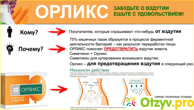 Расщепить эти вещества может только фермент галактозидаза, который и является главным веществом препарата Орликс. Фермент способен расщеплять олигосахариды ло состояния - моносахаридов. Таким образом, если применять препарат с таким ферментом, то проблемные вещества будут расщеплены еще не доходя до толстого кишечника и будут благополучно переварены и усвоены в необходимом для этого местоположении.