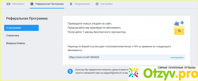 На сайте имеется реферальная программа. Свою реферальную ссылку можно найти в личном кабенете в разделе "Реферальная программа". Приглашайте друзей и знакомых изучать английский язык, получая удовольствие от просмотра сериалов и получайте бонусы. Причем бонус получает как приглашаемый, так и приглашенный, а точнее вы получите один месяц бесплатного просмотра за каждого приглашенного члена, который купит абонемент, а приглашенный, получит дополнительно десять процентов ко времени своего следующего абонемента.