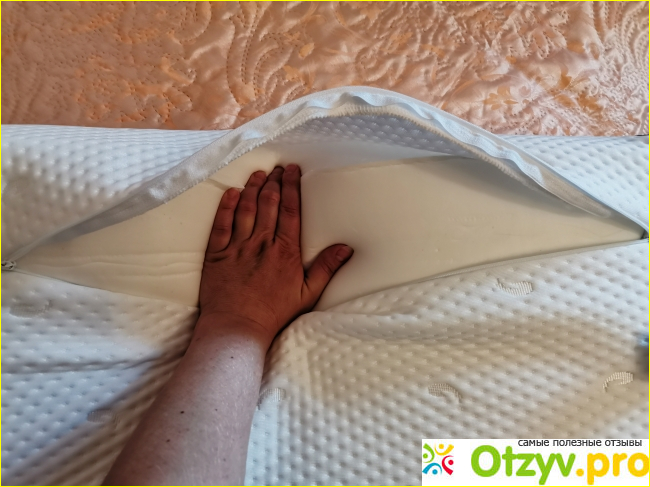 Сама подушка выполнена из высококачественной пены, которая имеет эффект запоминания. То есть если немного надавить на подушку на ней остаются вмятины повторяющие все изгибы тела. После быстро возвращается в свое положение.