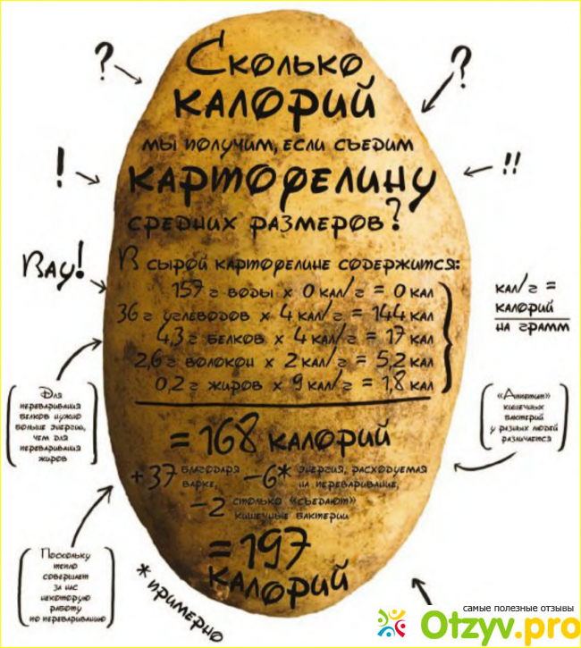 На рисунке выше четко видно, что влияет на калорийность конкретного продукта. Так, мы видим, что в сырой картофелине содержится 157 грамм воды с нулевой калорийностью, 36 грамм углеводов. Их энергетическая ценность 4 калории на грамм, итого 144 калории. Также картофелина содержит 4,3 грамма белков их ценность как и у углеводов - 4 калории. 2,6 грамм волокон с энергетической ценностью 2 калории и 0,2 грамма жиров с ценностью 9 калорий. Итого и получаем 168 калорий. При варке калорийность растет до 197 калорий.