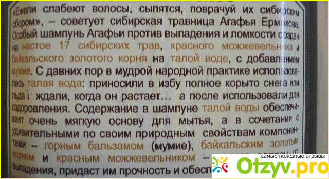 Состав шампуня меня порадовал большим количеством полезных экстрактов и компонентов. В составе содержится даже талая вода, чему я весьма рада. О ее пользе я не только наслышана, но и проверяла на собственном опыте, было время когда в моей морозилке были замороженные бутыли с водой. Помимо талой воды в составе настой 17 сибирских трав, а это очень много. И даже витамин В5 нашел место в длинном перечне компонентов. Состав меня порадовал, он не идеальный, но весьма впечатляет своими полезными составляющими.