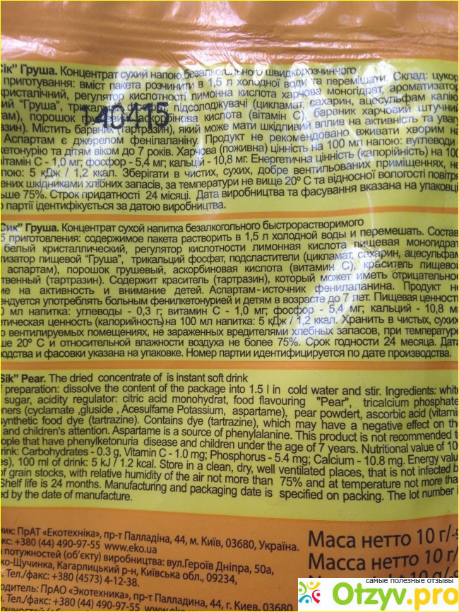В пакетике гранулы белого и желтого цвета. Гранул белого цвета меньше и их мало, потому они почти не видны. Порошок грушового концентрата не пахнет грушей, а отталкивающе пахнет чем то явно химическим.