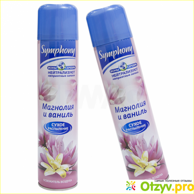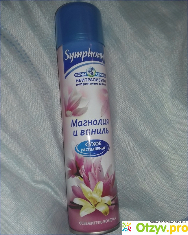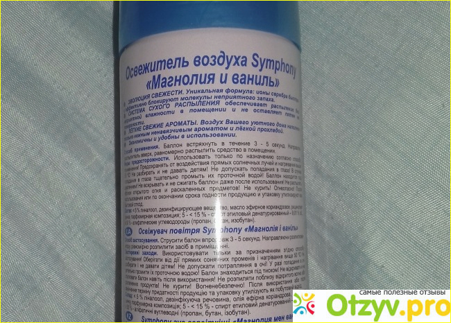 Флакон удлиненный, в диаметре он примерно пять-шесть сантиметров. Цветовое оформление, как я считаю, вполне удачное и стильное. Основное цветовое оформление у данного флакона розовенькое, а все остальное сделано синим цветом. Сверху вниз на флаконе нанесена марка - Symphony, далее написано, что данный освежитель содержит ионы серебра, далее написано название - "Магнолия и ваниль", также на флаконе указано, что данный освежитель распыляется сухим образом. И уже в самом низу на флаконе написано, что это освежитель воздуха.