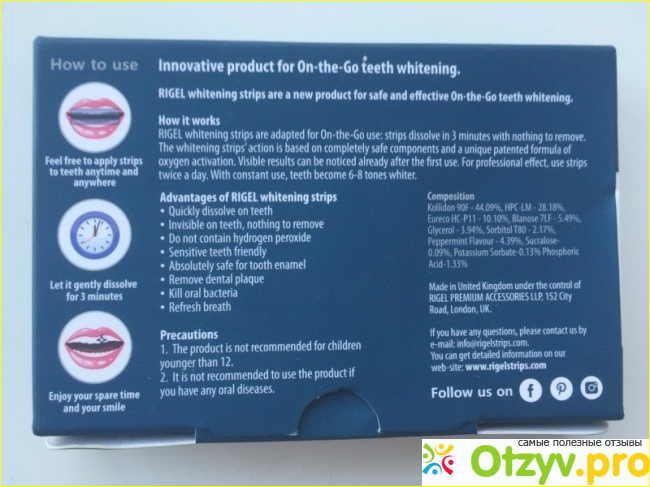 При наложении на зубы, через несколько минут полоски растворяются под воздействием слюны, превращаясь в тонкий слой активного геля. После чего они полностью смываются со слюной в течение 15-20 минут. Отбеливающие полоски RIGEL содержат европейскую запатентованную формулу Eureco HC с активным кислородом, которая бережно отбеливает ваши зубы, оставляя мятный привкус и освежая дыхание и сохраняет свежесть на весь день. Состав полосок очень бережный, более натуральный чем отбеливание в любой стоматологии, ведь их средства химические. Полоски для профессионального отбеливания не содержат перекиси водорода или карбамида, использование которых негативно влияет на зубную эмаль, и должно осуществляться только под присмотром стоматолога, тут только хорошие составляющие