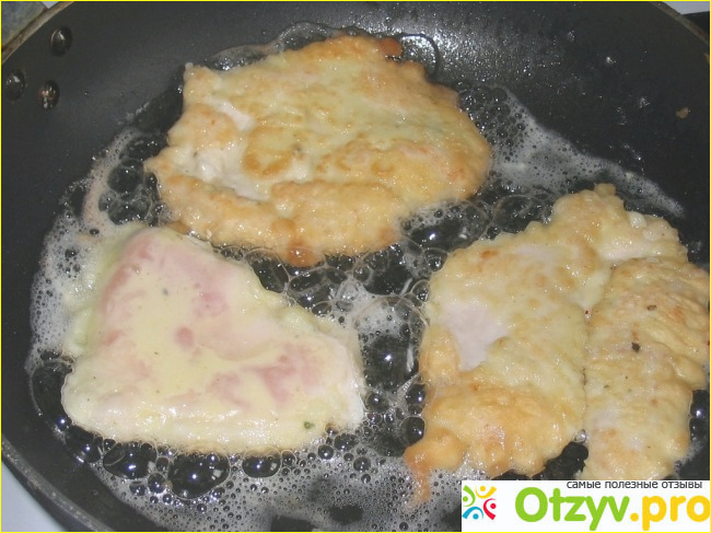 Когда все мясо подготовлено в глубокую сковороду наливаем растительное рафинированное масло и ставим ее на средний огонь. Масло хорошо прокаливаем. Каждый кусок отбивной хорошенько обмакиваем в кляре и выкладываем жарить на сковороду.