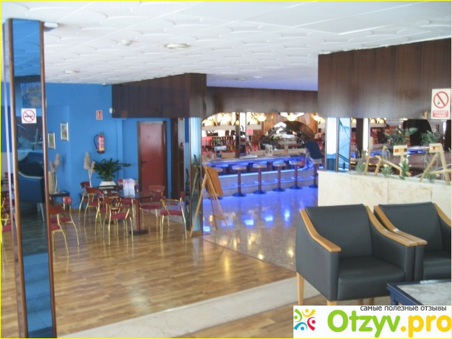 Но зато сразу же чувствуется сервис. Ведь в номере здесь убираются каждый день, независимо от того оставляешь ты чаевые или нет. Да и само оформление отеля очень даже достойное и приятное. И сразу же среди всей этой обстановки в глаза бросается отделка испанской плиточкой. Ну, а внизу бар гостиницы выделяется своей синеватой подсветкой.