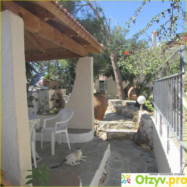 По сути отель представляет собой старую виллу (построен в 70-х годах прошлого века) и состоит из шести отдельно стоящих апартаментов, каждый имеет свой отдельный вход и номер. На фото номер !, точнее вид из него на беседку, где есть обеденный стол и стулья для желающих покушать на свежем воздухе. Однако нам это не удалось, поскольку множество хозяйских кошек пришли к нам в гости и полезли на стол. Надо отметить, что в дом они не заходят, в этом смысле можно быть спокойным, но на улице мы больше обедать не пытались.