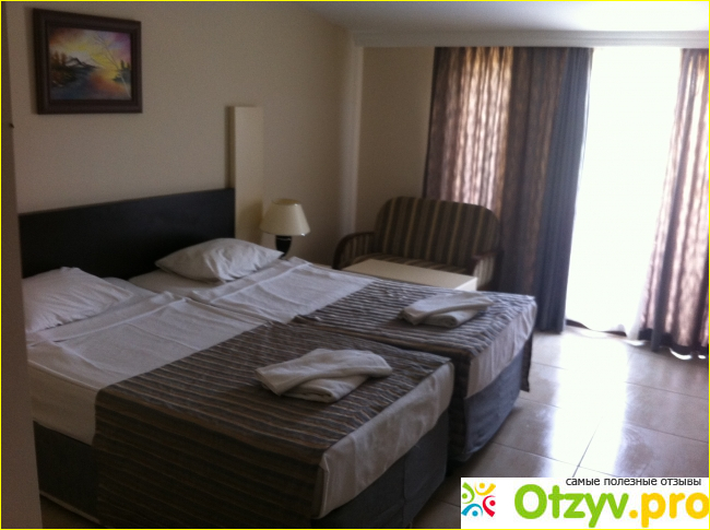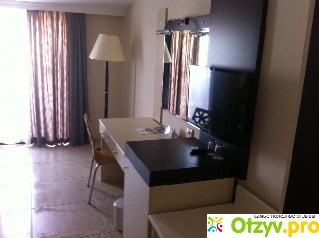 Есть все необходимое - кровати, тумбочки, телевизор (есть несколько русских каналов), мини-бар. Кстати, напитки выдаются только по заезду и забирать их нужно самостоятельно по карточке в главном корпусе, в баре.