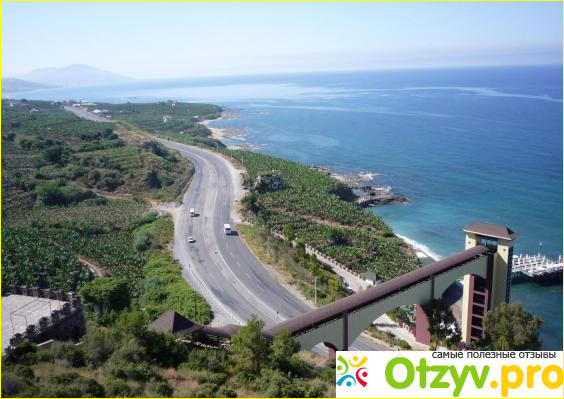 Отель располагается достаточно далеко от аэропорта и центра Аланьи, если ехать по побережью на автобусе, то отель будет самым последним в линии на выезде из Аланьи, за ним уже никаких отелей и туристической зоны нет.