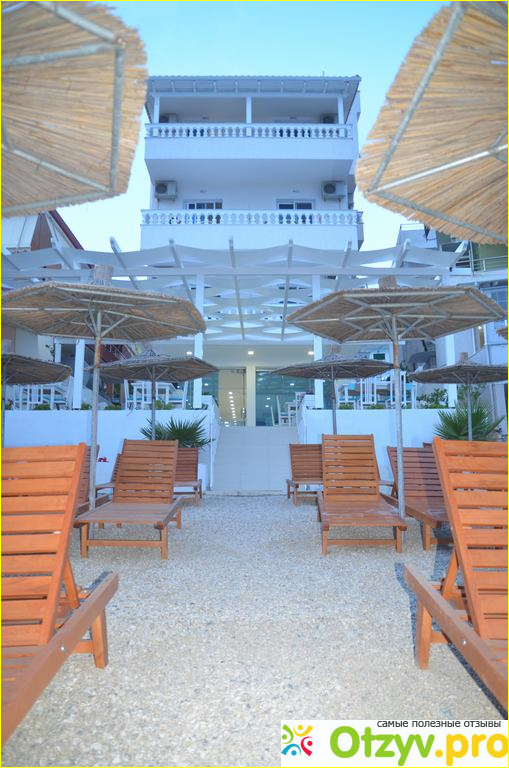 Итак, Vila E Bardhe (Белая Вилла) расположена в славном городе Саранда, что в Албании. У отеля есть свой кусочек пляжа с зонтиками и шезлонгами. Точнее говоря прямо из ресторана отеля вы спускаетесь по маленькой лесенке на пляж (галечный).