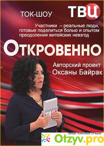 Приветствую всех читателей своего отзыва. Расскажу я вам сегодня об одной шоу-телепрограмме под названием " Откровенно" с ведущей Оксаной Байрак. Выходит по будням, в вечернее время, канал " Тв Центр".