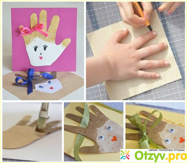 Делается эта открытка очень легко, только ребенку будет нужна помощь, чтобы обвести его ручку и потом ее вырезать, если ребенок еще не владеет ножничками. Для создания такой открытки необходимо будет взять лист бумаги, можно сложить его пополам и тогда открытка будет открываться, а можно просто обвести и вырезать ручку ребенка. Затем эту ручку можно наклеить на цветную бумагу, разрисовать ее, украсить по-своему, написать для бабушки теплые слова и такая открытка будет очень оригинальной. А еще, через несколько лет, когда ребенок вырастет, у него ручка тоже станет больше и можно будет сравнить, какая же была ручка, когда малыш делал открытку. И бабушке будет приятно в руках держать маленькую ручку своего внука или внучки.