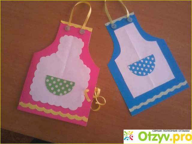 Если ребенок еще маленький, то вырезать ему могут помочь родители, а потом ребенок может сам все приклеивать. Для начала, нужно вырезать из картона сам фартух и сверху вырезать фартушек меньшего размера из белой бумаги. По контуру белый фартушек можно сделать ажурным, чтобы было красивее и обязательно будет нужно вырезать карманчик, как на настоящих фартухах, чтобы было красиво. И все эти три элемента необходимо приклеить друг к другу. После этого, нужно приклеить наверху кусочек атласной ленточки и сверху две пуговицы, как в обычных фартушках. По низу и по верху можно украсить красивой каемочкой. Вот такие замечательные открыточки получатся. На обратной стороне можно еще бабушке написать приятные и теплые слова.