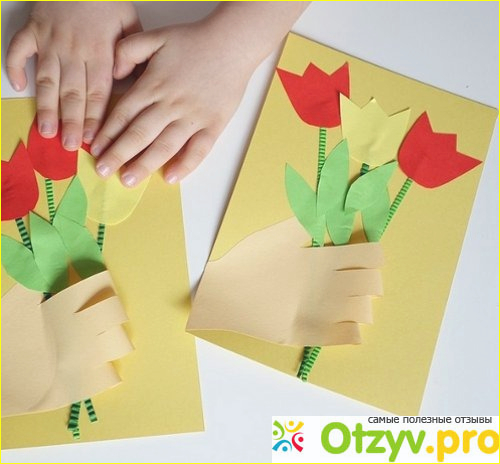 Открытка с цветочкамиТакая открыточка тоже будет очень интересная. Тут тоже будет нужен цветной картон, цветная бумага, ножницы и клей. Для начала необходимо вырезать ручку ребенка, цветочки (они могут быть абсолютно любыми), листики для цветок и стебельки. И потом аккуратно приклеить на цветной картон сначала стебельки, листики цветочков, а потом сами цветочки и уже самой последней, ручку ребеночка. В итоге, получится, словно в маленькой ручке букетик с цветами.