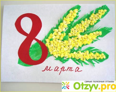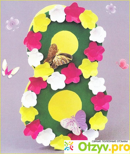 Потом необходимо из цветной бумаги вырезать много цветочков, они также могут быть разного цвета. В этом также следует помочь ребенку. А затем ребенок может уже справиться и самостоятельно, необходимо каждый цветочек намазать клеем и приклеить по контуру нашей бумажной восьмерки. В принципе, открытка готова. Но если у вас есть еще какие-то красивые элементы, блестки, пайетки, то ими смело можно украсить такую замечательную открытку.