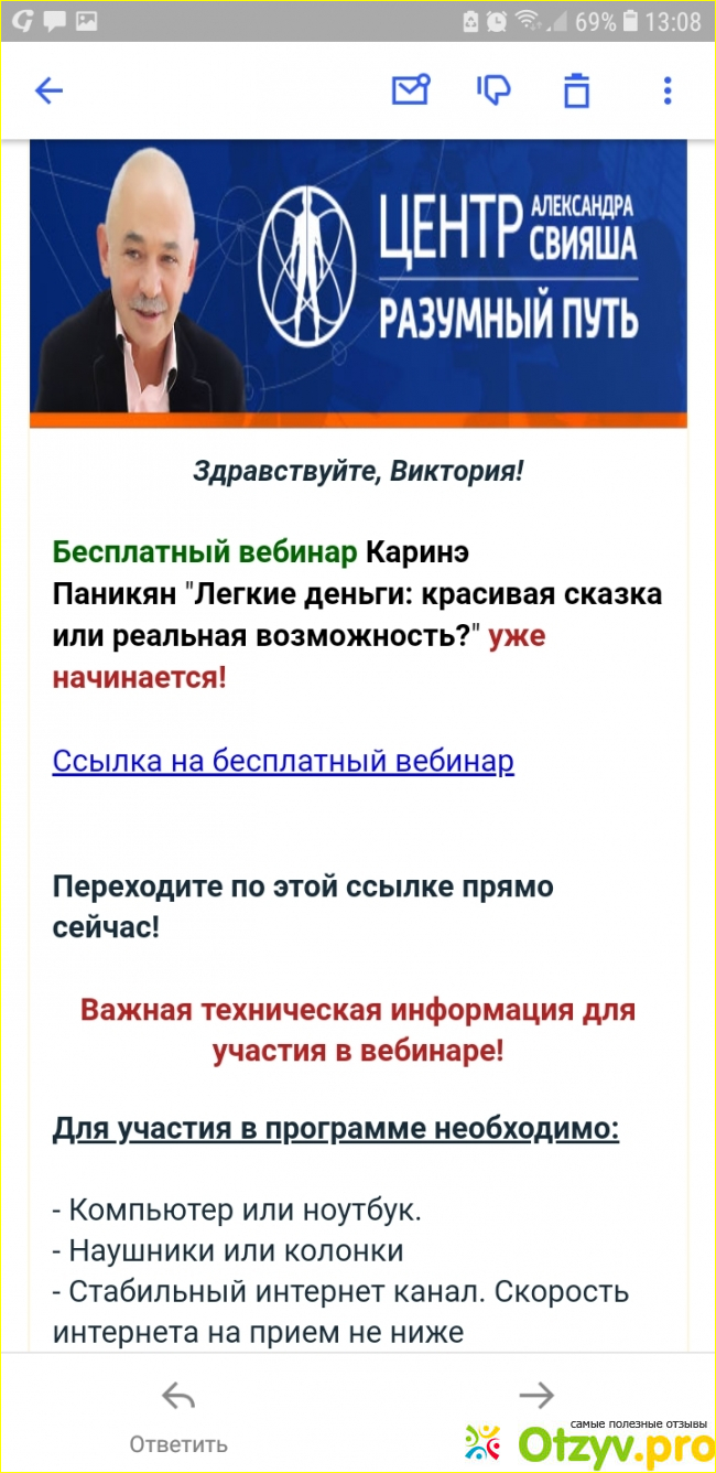 Из такого письма потом можно сделать переход на сам вебинар либо его запись.