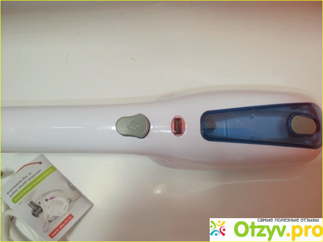 Ну а теперь я вам хочу рассказать про особенности данного прибора. В самом верху у него находится специальное отверстие куда вы можете наливать воду. Объем самого резервуара в отпариватели составляет 100 мл. Так же на самом приборе есть довольно большая кнопка на котором нарисован пар. Как раз если нажать на эту кнопку начинается подача пара в самом низу. Но лично мне показалось , что сама кнопка очень тугая и нажимать ее совсем не удобно.