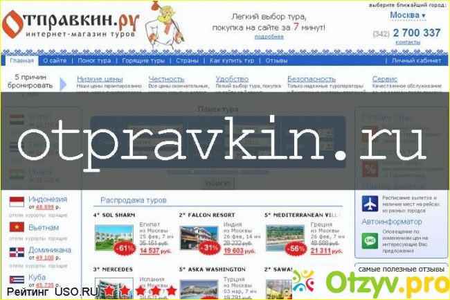 Среди турагентств, услугами которых мы пользовались в последние годы, я бы выделила туристическое агентство "Отправкин", точнее сайт Отправкин. ру. На этом сайте мы дважды покупали путевки и оба раза остались довольными. Причем варианты можно выбирать самому, но можно обратиться и к помощи менеджеров. Как это происходит? После регистрации на сайте Отправкин точка ру мы подбираем себе подходящий вариант (в прошлом году это был тур в Объединенные Арабские Эмираты), затем заполняем формы анкет и прочих документов, по ним получаем настоящие документы (визы, паспорта, путевки) в самом турагентстве. Оплачиваем (можно и безналичными) и ждем выезда. То есть никакой возни, бесконечных звонков, согласований и т. д., все четко и быстро. Никаких проблем не возникло и во время отдыха, с этим агентством работают многие фирмы и его рейтинг высокий.