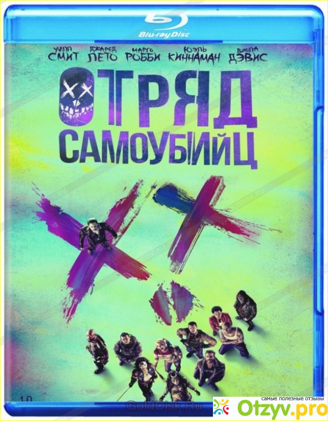 На изображении видно, как выглядит новый комедийный боевик знаменитого режиссера Дэвида Эйра, который называется "Отряд самоубийц" (2016) и коробочка Блю Рей: