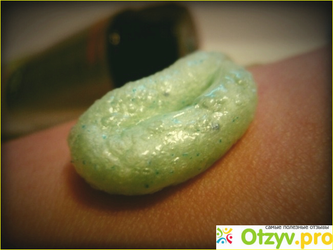 Скраб приятного ментолового цвета, с перламутровым блеском, содержит гранулы разного размера которые не царапают кожу а очень мягко очищают. Мне по консистенции скраб напоминает дорогую пену для бритья, средство практически не пениться, имеет приятный, свежий травяной запах.