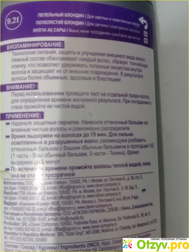 В целом могу сказать, что средство меня не разочаровало, даже приятно удивило. Бальзам отлично убирает желтизну, придает благородный пепельный цвет и блеск. Но все таки средство очень концентрированное и может пачкать руки, так что наносить нужно в перчатках. При нанесении на волосы не течет, если попадает на кожу, то легко стирается, ногтевые пластины красит хорошо) Производитель рекомендует перед покраской волос сделать тест на отдельной прядке, так что прежде чем ругать данное средство и с синими волосами в истерике писать гневный отзыв о Тонике, внимательно прочтите инструкцию!