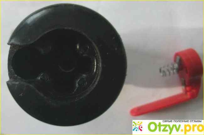 Вид сверху. Красная деталь - узел выключателя. В корпусе отвёртки - место для батареек.