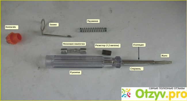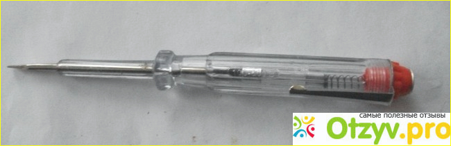Устроена отвёртка просто. Индикаторные отвёртки выпускают многие фирмы, и в принципе, можно брать любую, различия между ними минимальны. Я немного расскажу, на что нужно обратить внимание при выборе, описывая эту модель. Корпус отвёртки изготовлен из прозрачного пластика, являющегося хорошим диэлектриком, это важное условие безопасности. Он не должен иметь повреждений, и должен быть сухим. Попадание влаги может привести к поражению электрическим током. Обратите внимание на стержень отвёртки, прилегающий к жалу. Он должен быть надёжно изолирован! При измерении этой частью отвёртки легко коснуться второго контакта или голого провода, что приведет к замыканию. Здесь "голый" участок не больше 1 см, остальная часть стержня покрыта слоем изоляции. У некоторых отвёрток его нет. У некоторых для изоляции на эту часть натянута термоусадочная трубка или простой кембрик, что, конечно, менее надежно. Внутри рукоятки находится резистор сопротивлением 1,2 мегаома. Назначение его - снизить ток, протекающий через отвёртку и тело человека до безопасных значений. Не следует его заменять на резистор с меньшим сопротивлением! Иногда так поступают, чтобы повысить яркость свечения, заменяют его на одноваттный резистор с зачищенными колпачками, например, типа МЛТ. Отвертка рассчитана на напряжения от 100 до 500 вольт. Для напряжения 220 вольт сопротивление этого резистора не должно быть меньше 470 ком! Вторая деталь- неоновая лампочка. Она поджимается к резистору, а он в свою очередь к стержню отвёртки пружинкой, имеющей второй контакт с "пятаком" на колпачке. У отвертки есть зажим, при необходимости удерживающий ее в кармане, по типу авторучки. Пользоваться отвёрткой просто. Жалом касаемся проводника, не забывая одним пальцем касаться контакта на колпачке.