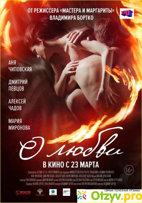 Начну с того, почему я в принципе заинтересовалась этим фильмом. Конечно же, сюжет показался мне не столь банальным, тем более я была уверена, что у Владимира Бортко получиться плохое кино просто не может. Да и определение фильма «О любви» как «Пятьдесят оттенков серого по-русски» также пусть и отчасти, но привлекло меня к просмотру. Не скажу, что я поклонница «Оттенков», но посмотреть, что там наснимали у нас на тему с явным эротическим подтекстом мне все-таки было очень интересно.