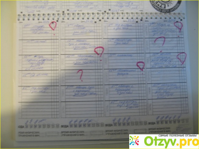 Красным - пометки тренера... Внизу количество стаканов воды, выпитого мною. Учитывая мой рост и вес воды я должна была выпивать 2 литра 300 мл, что реально мешало работе...