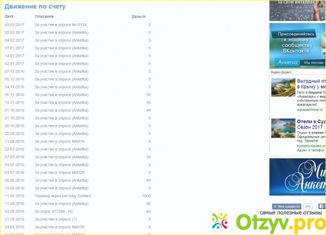 Для меня, как для пенсионера, Анкетка - это всего лишь не утомительная подработка. Причем деньги для категории таких людей как я копятся долго. На самом деле опросов для пенсионеров не так уж и много. Основная масса респондентов - это молодые родители с детьми и с автомобилями. И поскольку дети мои выросли, а автомобиль я не вожу, то и опросы мне приходят примерно 2-3 в месяц. Да и те часто прекращаются, так как выясняется, что я не подхожу. Но всё же приятный бонус за незначительную работу и моё внимание к Анкетке я получаю: пять рублей на лицевой счет. И если посмотреть пополнение моего лицевого счета в опроснике Анкетка, то видно, что это в основном суммы по пять рублей. Редко когда мне разрешают пройти опрос полностью, за что выплачивается 30-50 рублей.