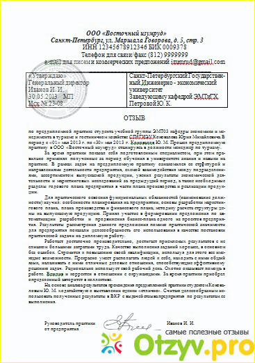 Итак, отзыв о практике (или характеристика) начинается с официального названия предприятия, его контактных данных (юридический и физический адрес, контактный телефон).