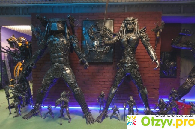 В праздники, наконец-то, выделили время и решили отправиться туда. Всё самое интересное начинается прямо на входе. Во дворе находится несколько скульптур, а также ретро автомобили и скульптуры, которые изготовлены из покрышек. Внутри музей состоит из нескольких различных тематических залов: это герои Марвел, Терминатор, Хищник и чужие, герои из фильмов про космос, Трансформеры и многое другое. Залы достаточно небольшие, но в них помещено много различных экспонатов, а также красиво разрисованные стены. При желании можно попасть в зону для праздников, где организовываются дни рождения для детей. Но мне кажется, такие праздники очень опасные, особенно для невоспитанных и гиперактивных детей. В самом конце выставки находиться ларёк с тематическими сувенирами, где также можно приобрести небольшие экспонаты, такие как, к примеру, столики, стулья, настенные панно и так далее. Для тех, кто устал, в музее предназначенны мягкие пуфики, а также автомат с кофе. Мы приезжали сюда в понедельник вечером, и в это время посетителей было немного. Особенно сильно сыновьям понравились животные, мотоциклы, чужие и хищники, Трансформеры, а также герои комиксов и блокбастеров. Экспонатов огромное количество, чаще всего они изготовлены из металлических частей автомобили. Большая часть из них ростом с человека, и даже больше. Фотографии получаются прекрасные, благодаря подсветке, которая меняет цвет. В сувенирных лавках мы купили пару игрушек для детей, но цены там очень высокие.