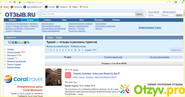 Сайт Отзыв.RU - это огромная площадка для любителей путешествий по всему свету. Там люди пишут отзывы, спрашивают, отвечают, делятся своим опытом. И конечно, о Турции там написано очень много. Чтобы найти нужную информацию, следует просто зайти в раздел "Форум" и из списка выбрать стран выбрать Турцию.