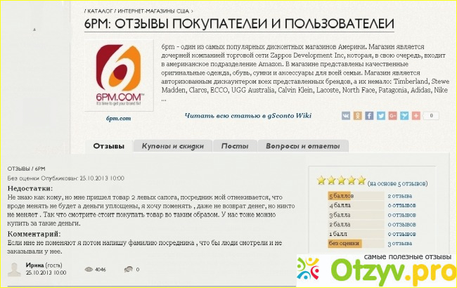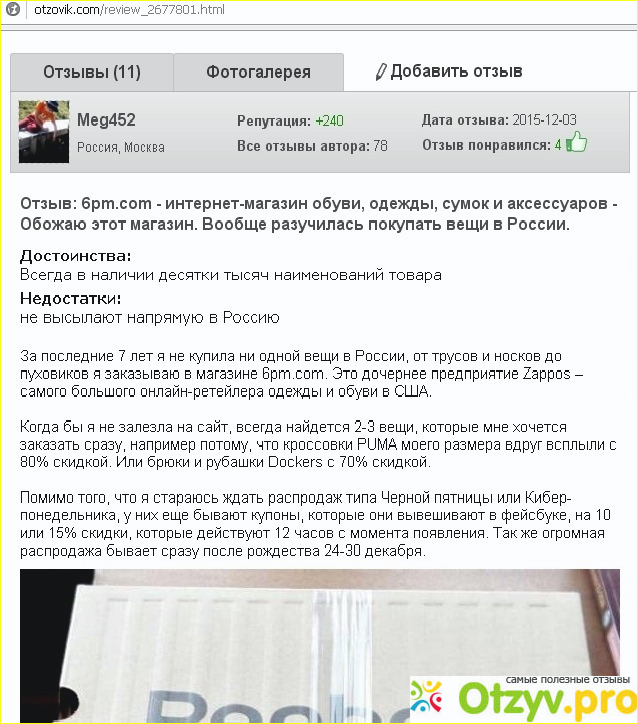Заглянем на другой сайт. тут уже 24 отзыва и тоже все пятёрки. Это удивляет. В первом же самом свежем отзыве девушка пишет, что заказала там несколько пар обуви (брэндовая, со скидкой от 50 до 80%) и пальто. Но пальто по размеру не подошло. По США заказ шел двое суток и бесплатно, поскольку её заказ превышал 50 долларов (это и для одной вещи можно). Вторым условием бесплатной доставки по территории США является покупка двух и более вещей. Конечно, достаточно выполнить какое-то одно условие. В Украину заказ шел 10 дней и за доставку она заплатила 11 долларов.