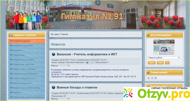 Я знаю, сейчас почти каждая уважающая себя гимназия, школа, да и вообще любое учебное заведение имеет свой официальный сайт в интернете. Это очень удобно, ведь ученики и родители могут найти всю необходимую информацию как о самой школе, посмотреть фотографии, так и об учителях, их наградах и т. д.. Сайт гимназии №91 мне очень понравился своей лаконичностью. Здесь можно найти очень много стандартных разделов о самой гимназии, ее истории, жизни, мероприятиях. Все фотографии с концертов, праздников. Также порадовала забота о разных категориях населения: для слабовидящих есть даже возможность увеличения экрана! Что ни говори, а на свой сайт гимназия №91 точно не поскупилась!
