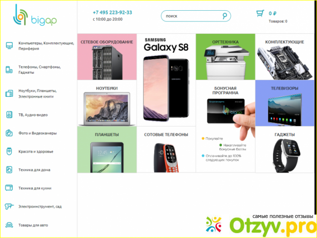 Добрый день, уважаемый посетитель моего отзыва. Сегодня я хочу с вами поговорить об интернет-магазине бытовой и электронной техники Bigap. Вообще в последнее время заказывать технику стало гораздо удобнее на сайте, вам не надо часами торчать в гипермаркетах, приседать на уши продавцам-консультантам, вы можете спокойно и не торопясь выбрать необходимую технику на сайте, что мы однажды с супругой сделали.