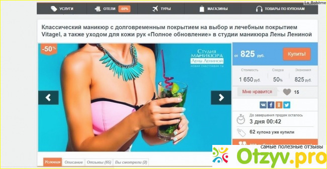 В описании каждой акции можно найти отзывы покупателей, дату завершения, условия, комментарии, фото, адрес и телефон.
