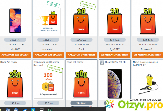 Например, начальная цена какого-либо товара равна ста рублям. Вы делаете ставку, и цена повышается на десять рублей. Если по истечении пятнадцати или двадцати секунд вашу ставку никто не перебил, вы побеждаете и получаете товар за эту цену. Для победителя действует бесплатная доставка. Мне понравилось, это реально захватывает! Я не слишком азартный человек, но делать ставки было интересно. Данный аукцион является беспроигрышным, здесь имеются даже подарочные сертификаты. Однако, я бы не рискнула такой приобрести. Неизвестно, понравится ли близкому такой подарок или нет.