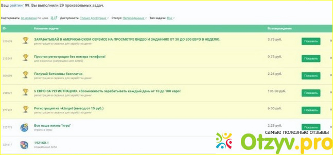 Сам дизайн сайта мне очень понравился так как всё достаточно понятно, красивый вид, а самое главное всё честно и это огромный плюс. Вот и я решила немного подзаработать на данном сайте, для начала решила начать с социальных сетей. Мне понравилось тем что особо усилий прикладывать не нужно зайти, поставить лайки, подписаться, или вступить в какую нибудь группу и всё, далее работа идёт на проверку. На всё уходит где-то секунды, что касается оплаты то в основном за одно выполненное задание можно получить от шестидесяти до семидесяти пяти копеек. Естественно это очень мало даже если в день сделаешь тридцать заданий, но всё же тут ничего сложного нет и хоть как то оплачивается. Для школьников возможно подойдёт, но для меня нужно что-то по серьёзнее, а так хоть мелочь всё равно приятно. Так же пробовала исполнять произвольные задания, именно здесь есть возможность заработать более крупную сумму. В данном разделе вы сможете встретить различные задания которые очень хорошо оплачиваются. Можно регистрироваться на каком либо сайте, посещение сайта, написать какой-либо отзыв, лайкнуть запись, просмотреть видео или скачать какой-либо из предложенных файлов, и много другое ассортимент заданий очень велик. За проделанную работу вы сможете получать от шестидесяти копеек до двести рублей. Что очень радует так как возможно заработать на данном задании вполне приличную сумму. Конечно же имеется и минус:если необходимо зарегистрироваться тоже на сайте где можно заработать, нужно сделать задания, на нём и получить прибыль, только тогда заплатят вам за задание. Конечно за регистрацию на другом сайте, этому платят деньги, а вам дают лишь часть, но всё же приятно получить хорошую сумму заработка. Пробовала заработать в приложении, для этого нужно предложенное приложение скачать себе на смартфон и добавить отзыв на него, если устанавливаете на андроид то платят два с половиной рубля, а на IOS три рубля. В принципе сложного здесь я ничего не нахожу, заходишь, скачиваешь, пишешь отзыв и всё готова, за день можно устанавливать приложения вполне прилично. И был последняя категория заработка это опрос, приходят задания отвечаешь на вопросы и всё. И так сделала для себя вывод, что заработать на данном сайте вполне реально, особенно если выполнять задания из произвольных так как оплачиваются данные задания очень хорошо, только представьте сколько в день можно выполнить и заработать на этом деньги. Но прежде чем отправлять необходимо заполнить отчёт, и только тогда данное задание пойдёт на проверку. В основном необходимо загружать скрин выполненного задания и всё. Конечно же за выполненное задание на следующий день вам никто не оплатит, для начала вашу работу будут тщательно проверять, на проверку уходит времени многовато, но придётся подождать так как выбора никакого нет. Вывод денег на кошелёк происходит моментально в течение пяти минут, даже имеется возможность вывести маленькую сумму, то-есть ограничений никаких нет. В принципе сайтом я осталась довольна, выплаты проходят на отлично без всякого обмана, что этим мне понравилось. Заработок на данном сайте не велик, но всё же хоть какой-то доход есть.