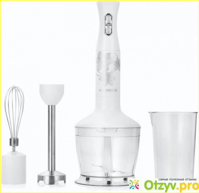 Блендер был в хорошей упаковке, он предназначен для погружного испольльзования. Я бы не отнес данный блендер к разряду навороченных, но в комплекте идут три насадки: одна предназначена для взбития, другая для мелкого измельчения и третья - для более крупного измельчения. Я каждое утро готовлю себе амлет из яиц, а взбивать их в ручную - дело очень кропотливое, и тут как раз на помощь мне приходит именно блендер. Также же мы частенько любим пить свежевыжатый сок и для этого нам надо размельчить фрукты и овощи, для этого нам как раз под руку попадается мельничек с объемом 0,6 литров. Этого вполне достаточно. Также в комплекте идет мерный стакан объемом 500 милилитров с высеченными рейками. Очень удобная вещь в хозяйстве, к тому же он довольно мощный, мощность его составляет 600 Вт, но он много электричества не жрет. Что касаемо производительности, то скорость оборотов у него 14000 в минуту и имеются две скорости вращения.