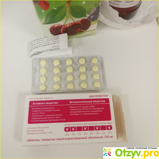 Второе различие, это то, что Циклоферон нужно не рассасывать держа во рту, а именно запивать водой, как практически все таблетки. Кстати, если попытаться таблетку все таки рассасывать, то вкус у нее будет крайне неприятный (это было видно по моему ребенку). Поэтому Циклоферон желателен уже для тех деток, которые могут спокойно проглотить таблетку не подавившись ей, то есть не маленьким.