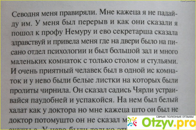 Когда начинаешь знакомиться с книгой сразу же замечаешь её особенности, с первой страницы заметно, что грамматики практически нет!(Но это не спроста) Но по мере прочтения, написанное становится все правильнее и правильнее. И это не может не радовать, ведь становится легче читать и не только. Тут больше радуешься за главного героя и переживаешь все вместе с ним, этому сопутствует и стиль изложения. Это записи из журнала нашего главного героя.