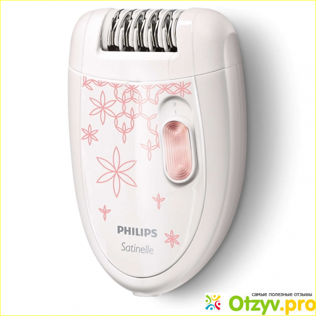 Чтобы не было скольжения устройства в руке, его сделали немного согнутым по форме, а сверху он вообще рифленый, и не скользит. Есть кнопка, при помощи которой производится переключение скорости, а корпус снабжен рисунком, в виде цветка. Эпилятор снабжён достаточно длинным проводом, который в случае необхoдимости можно отсоединить. На конце провода идет обычная вилка, при помощи которой он подключается к сети.