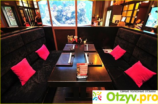 Для посещения ресторана нужно спуститься вниз по ступенькам лестницы, - само заведение находится в полуподвальном помещении, - однако, тем не менее здесь очень просторно, есть где развернуться, сам интерьер выполнен в пастельных приятных в светлых тонах. Если оглядеться вокруг, то можно отметить, что везде присутствует своеобразный японский дух, многие отмечают, что здесь имеется реальное сходство с реальными японцами ресторанами. На стенах весит большое количество картин, выполненных в японском стиле. На них изображены разные интересные личности японской национальности, а на некоторых вообще непонятно что изображено, и для несведущих людей, незнакомых с японской культурой, понять содержание этих произведений искусства будет довольно проблематично. Однако, большинство картин довольно интересны и понятны, и реально радуют глаз.