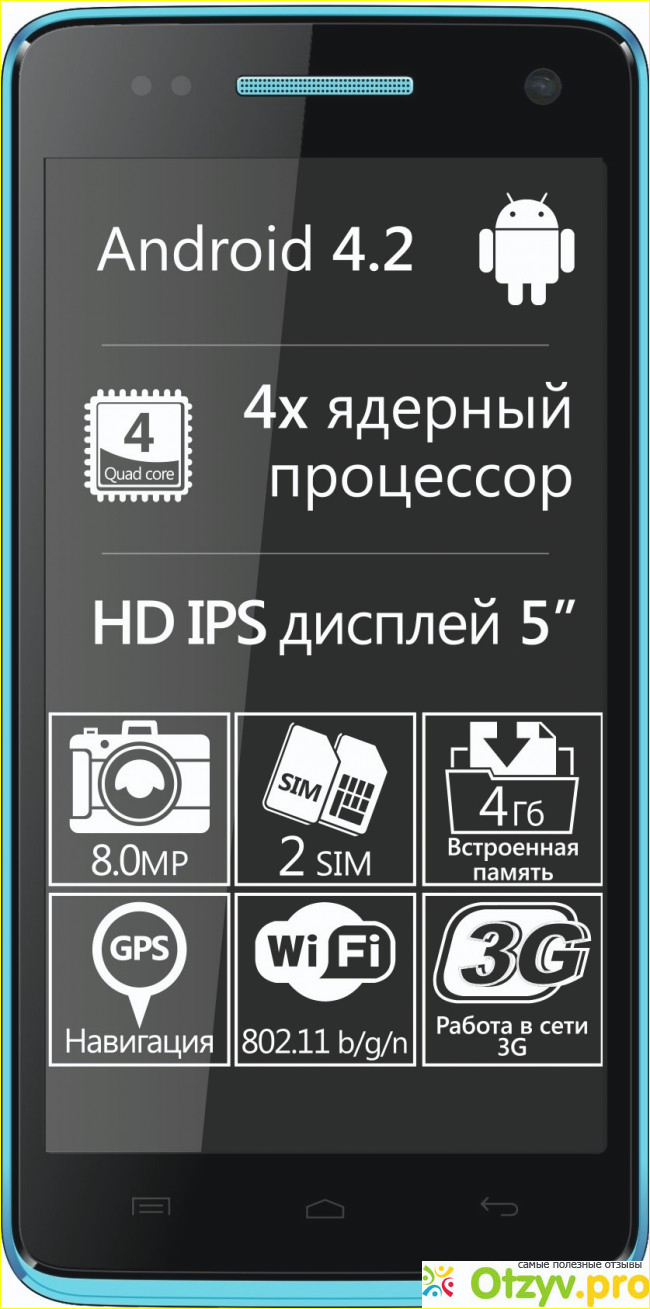 Стандартный размер современного смартфона с пятидюймовым экраном. Задняя крышка матовая, оставляет отпечатки. Телефон довольно таки толстый - 10 милиметров. При включении издаёт противную мелодию, из за которой этот телефон даже разбить хочется. Ничем не примечателен, повторюсь. Включается не быстро, но и не сильно долго, операционная система android 4.2. Некрасивая версия jelly bean, и не более быстрая, чем предыдущие версии. Настройки все, как у остальных телефонов за такую цену. Здесь вообще всё, как у телефонов за такую цену. Процессор конечно же от mediatek, которые медленные, и при слабой нагрузке начинают тупить, и смартфон ловит кучу фризов. Даже если элементарно поставить стороннюю клавиатуру, процессор уже будет в ужасе. Клавиатура будет запускаться не сразу, и будет задержка при нажатии на клавиши. Многозадачности никакой нету. 4 ядра ни о чём не говорят, главное производитель и частота процессора, а так же оперативная память которой здесь гигабайт. И на том спасибо, а то в некоторых телефонах за такую цену - а это примерно 7 тысяч, вообще ставят по 512 мегабайт, что катастрофически мало. Но гигабайт в этом телефоне тоже не спасает. Многозадачность маленькая, если запустить к примеру ютуб, и вконтакте, то при выходе из ютуба вконакт лента запустится с начала, то есть нельзя элементарно оторваться от соц. сети что бы, например, написать заметку в каком - либо приложении. Конечно, когда телефон совсем новый он не очень сильно тупит, быстро перелистываются страницы, быстро запускаются некоторые приложения, но всё же уже есть некоторые нюансы в быстроте, и этому мешает куча ненужных стандартных приложений, которые нельзя удалить без рут прав. А получать рут права опасно, и телеон автоматически становится негарантийным. Приходится вручную останавливать и отключать ненужные сервисы, которые засоряют память. Об остальном, дисплей 5 дюймов с матрицей ips, что неплохо, углы обзора хорошие, цвета обычные, разрешение 1280*720 hd. Динамик громкий, но не качественный. Камера 8 мегапикселей, и фотографии делает быстро, и фокусирует моментально. Конечно ни как у iphone, но скорость съемки приятно удивила. dpi 320 точек. Короче ничего примечательного, но за ценник в 6500 - 7000 рублей у некоторых производителей характеристики ниже.