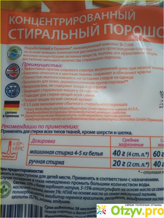 В составе нет хора и фосфатов. Это сегодня модно и безопасно, и это первое. На что я лично обратила внимание, когда захотела протестировать средство. А что же является ингредиентами данного порошка? на упаковке написано все детально, скажу лишь, что нужно читать внимательно и понимать, что такое карбонат натрия, отбеливатель на кислородной основе и так далее. Потому что моему супругу, например, эти составляющие были непонятными и до первого результата он не понимал мое желание проверить в действии данный порошок. Он также был приятно удивлен ценой, экономностью и безопасностью этого средства. Рекомендую попробовать, хотя бы в мини упаковке. Тем более, что цена просто смешна – одна стирка – 20 рублей.