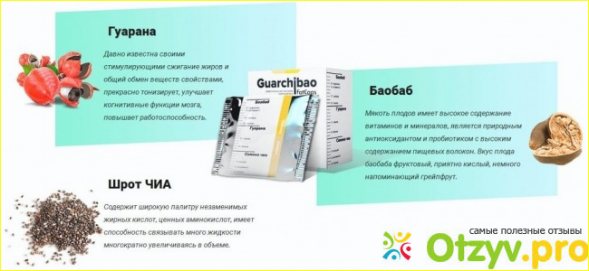 Так вот данное средство представляет собой саше с порошком. В каждом саше 25 грамм сухого вещества, необходимо готовить напиток, для этого нужно растворить порошок в 100 граммах воды и полученный напиток употреблять каждое утро на протяжении 4-х недель натощак. В упаковке мы также заметили инструкцию по применению на русском языке, где был также расписан состав данного средства: в составе три компонента: Гуарана, Семена Чио и Баобаб, собственно из них и складывается название Гуарчибао: каждый компонент отвечает за определенную функцию.