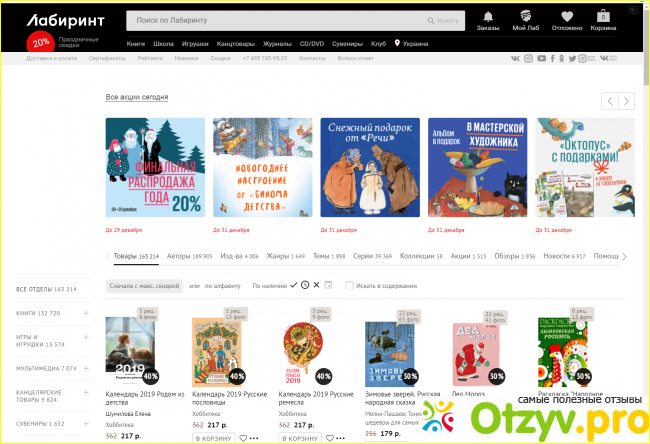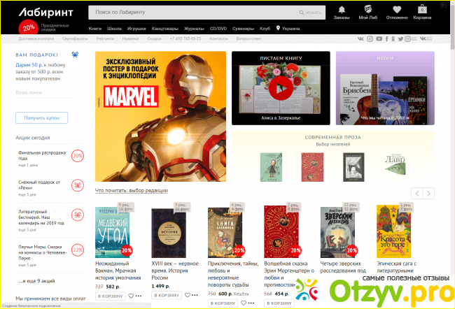 Книжный магазин "Лабиринт" представляет из себя интернет страницу, где можно зарегистрироваться, потому что постоянным клиентам идет каждый раз бонусная скидка. Один из самых часто заказываемых систем по книгам, потому что здесь их много. Собрана полная классика, детективы, детская литература для самых маленьких, развивающая, обучающая для школьников, студентов, выпускников и учителей.