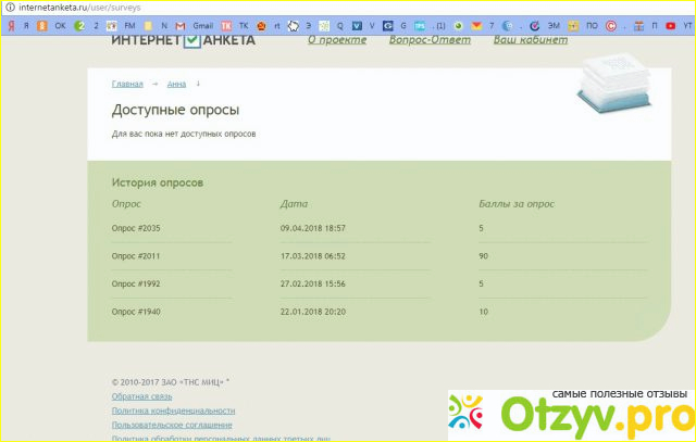Сайт internetanketa ru нашла в интернете случайно. Зарегистрировалась на нем, заполнила все данный и два месяца не было анкет. Я уже забыла про него, но через два месяца они начали приходить. Много денег за анкеты не платят. Минимальную сумму копила несколько месяца. Вывела деньги на электронных кошелек. Было приятно заработать первую небольшую сумму. Теперь стараюсь чаще просматривать почту, чтобы не пропустить анкеты. Если вы хотите сразу много зарабатывать, то этот сайт я не будут советовать. Ну а для получения небольшой копейки он подходит отлично. Главное, что здесь все-таки платят.